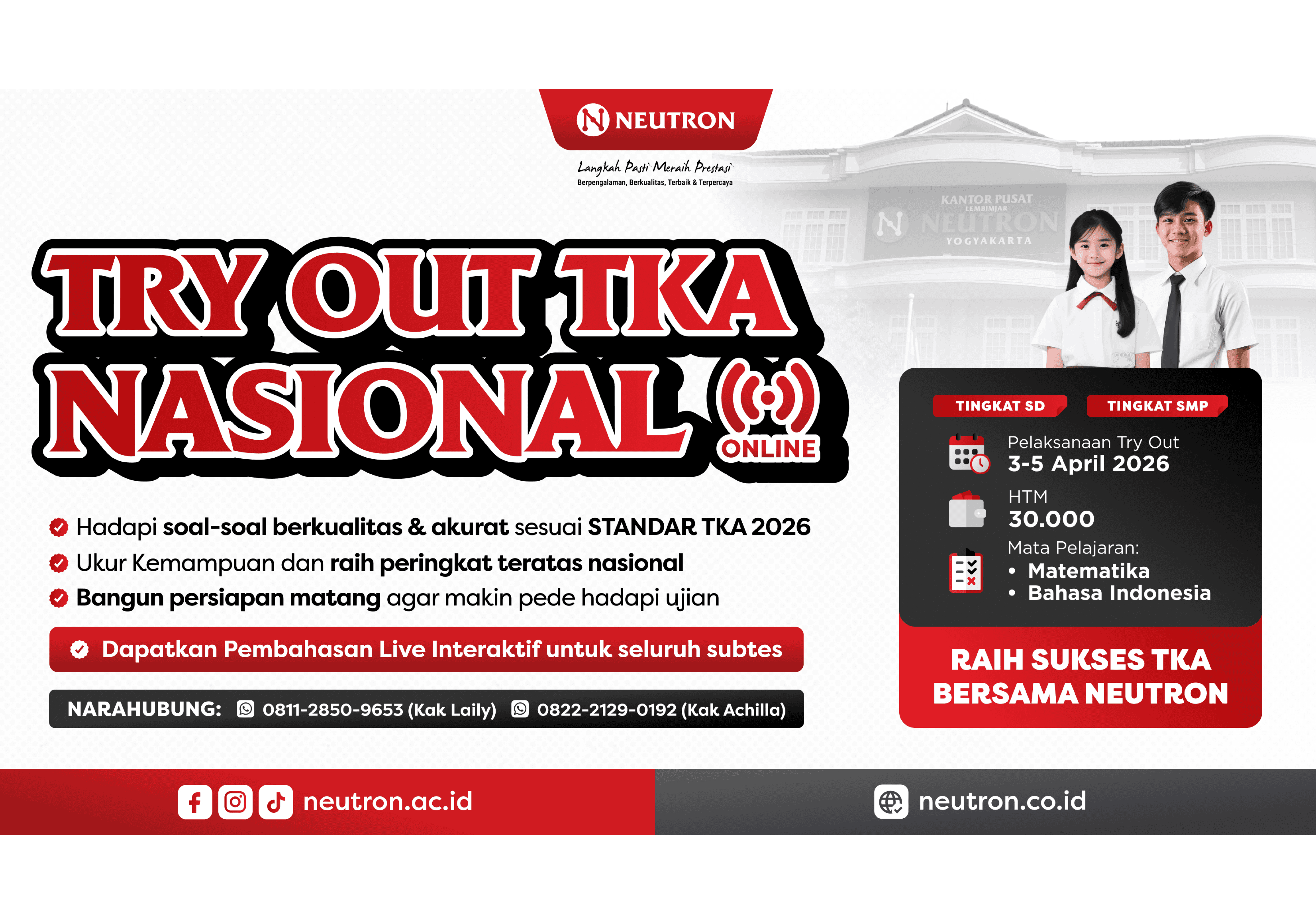 Try Out TKA Nasional adalah sebuah program dari Neutron yang dirancang untuk menjadi jembatan siswa dalam mengukur dan menguji kesiapan diri menghadapi ujian TKA. Kami percaya bahwa setiap langkah kecil dalam persiapan adalah bagian dari perjalanan besar menuju sekolah impian. Oleh karena itu, kami hadir untuk mendampingi setiap langkah dengan menyediakan simulasi ujian online soal-soal berkualitas tinggi, sesuai dengan standar TKA 2026.