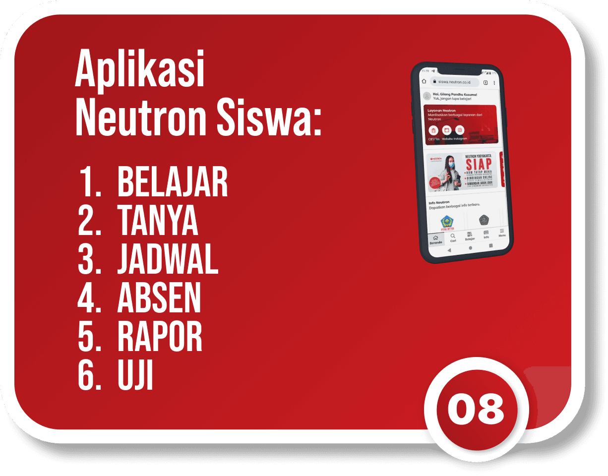 Selama lebih dari 30 tahun, NEUTRON telah menjadi lembaga bimbingan belajar pilihan siswa-siswi di Indonesia. Dengan lebih dari 121 cabang di Indonesia dan sekitar 2230 staf pengajar kompeten, NEUTRON terus berkomitmen memberikan program bimbingan belajar terbaik.