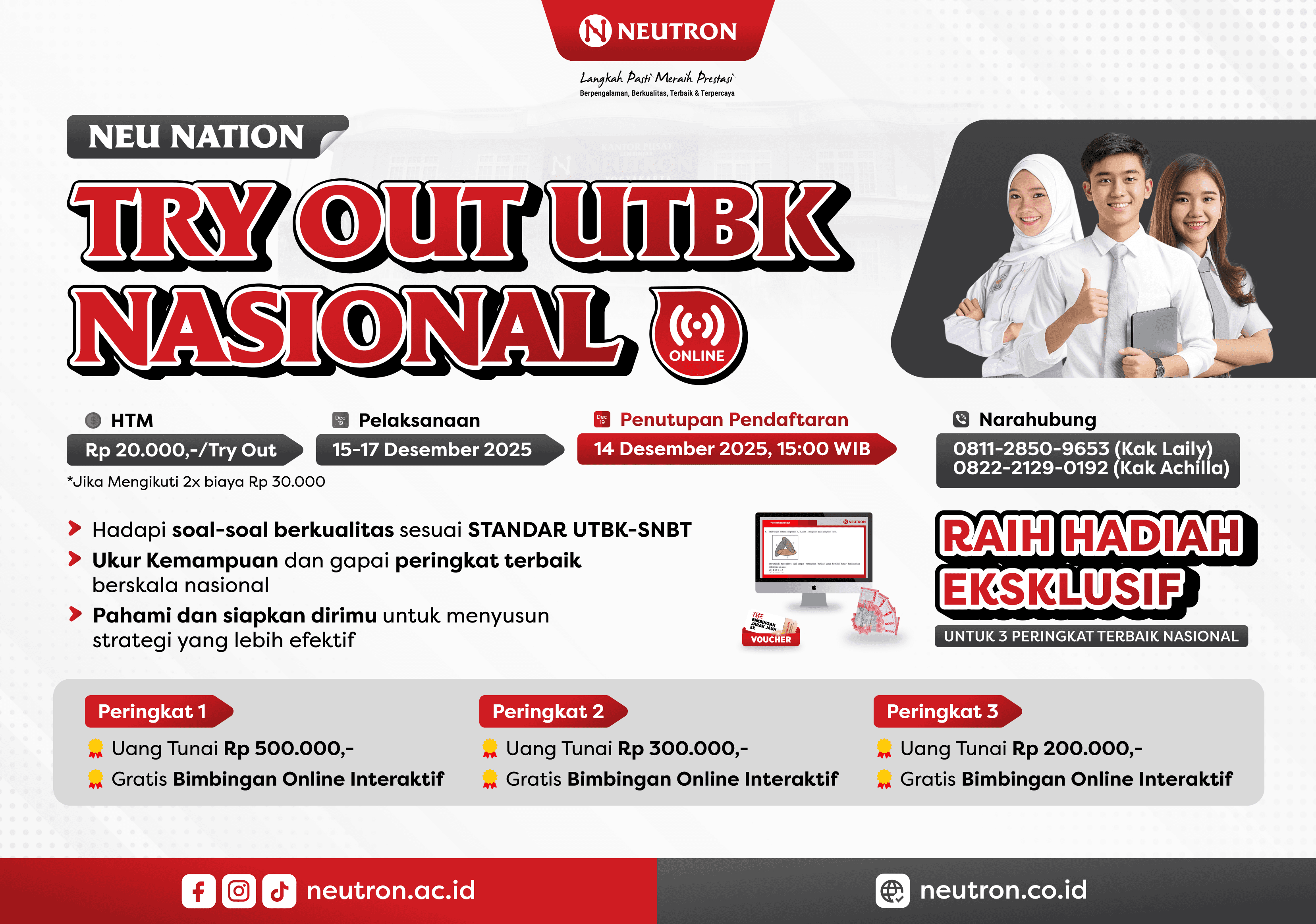Secara rutin dan berkelanjutan, NEUTRON menyelenggarakan berbagai acara seperti Try Out, Seminar, dan Kelas Khusus untuk meningkatkan kemampuan siswa-siswi Neutron. Cari tahu tentang acara NEUTRON selanjutnya di kotamu.
